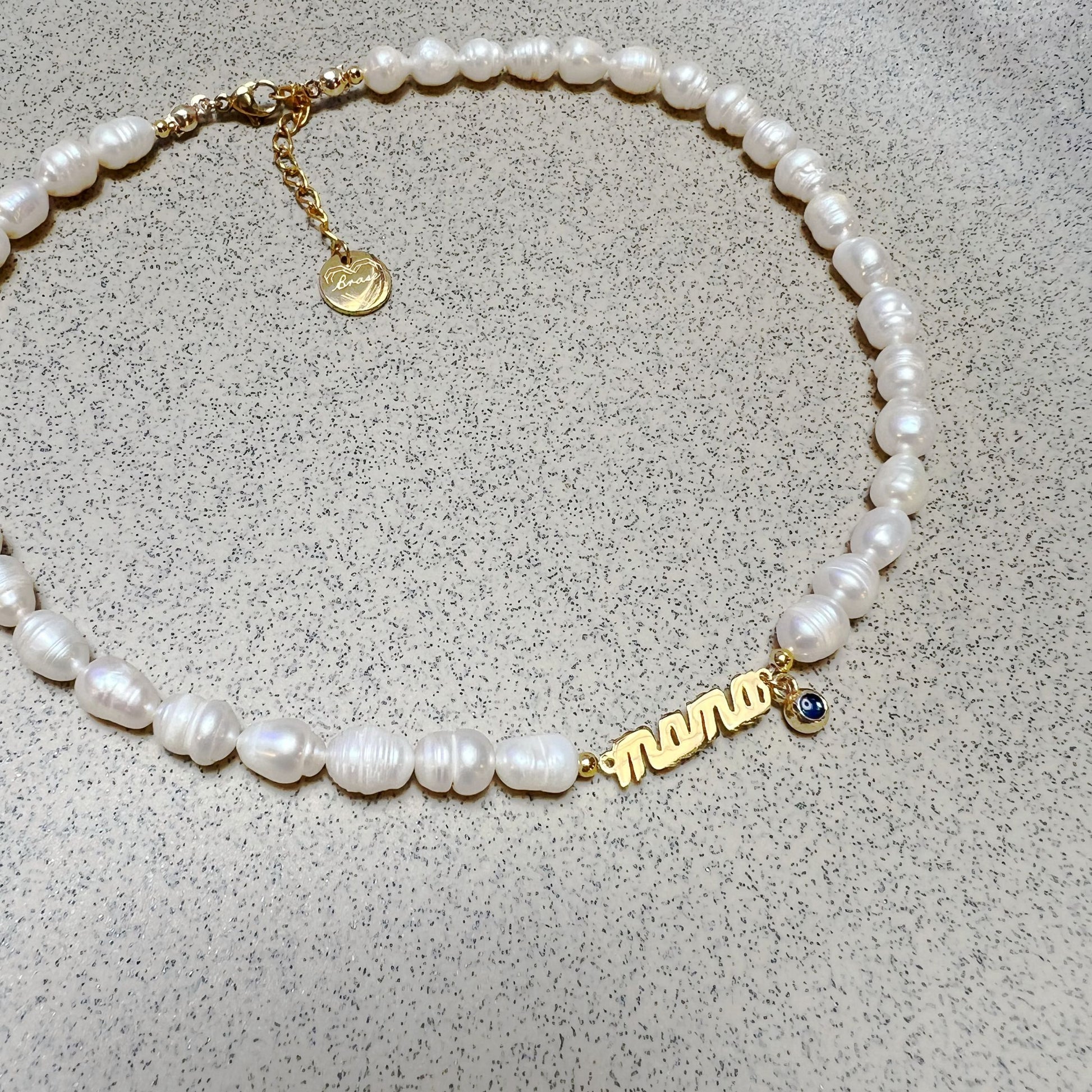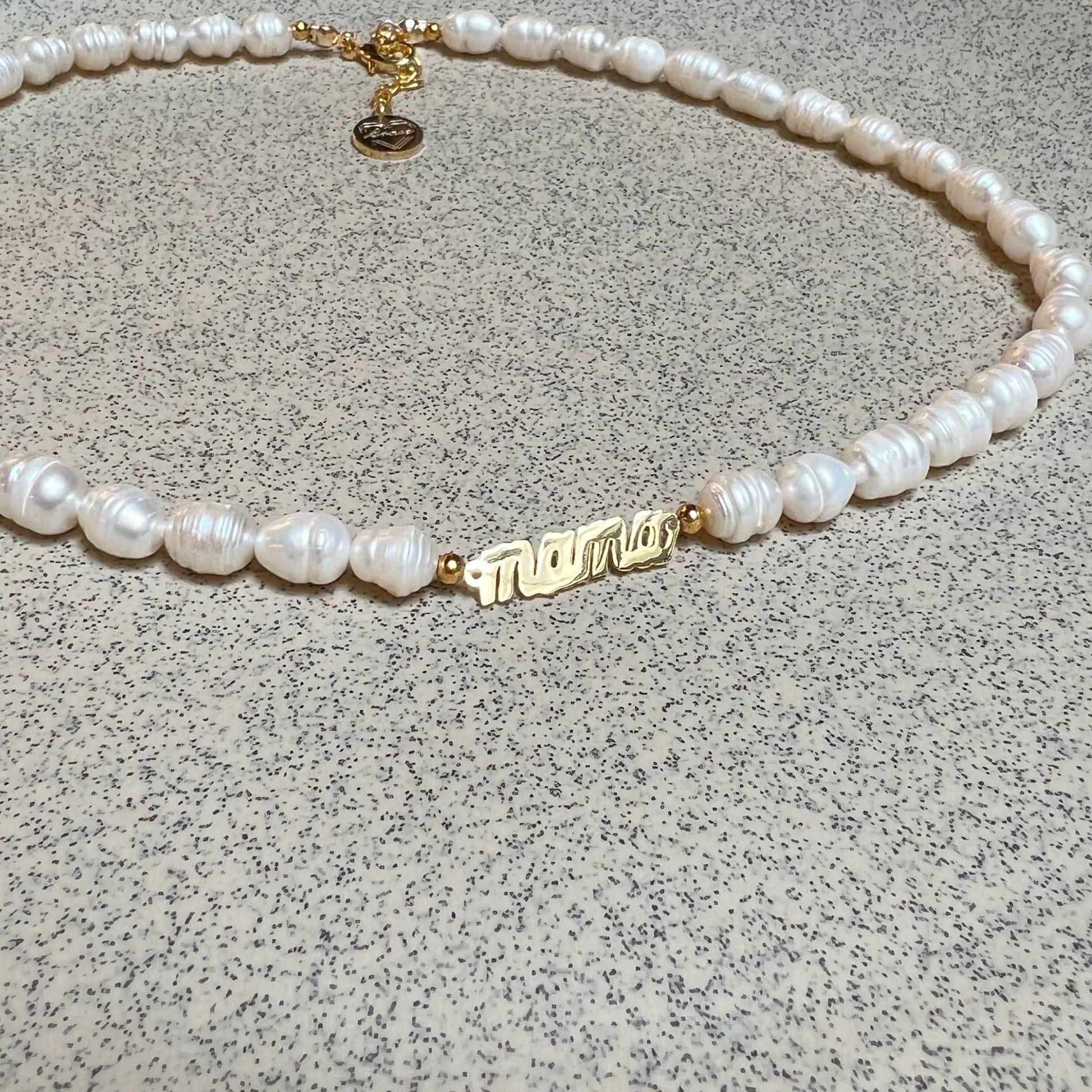Pearl beaded necklace with “mama” charm. A unique design, cute and sophisticated. Makes an amazing gift.