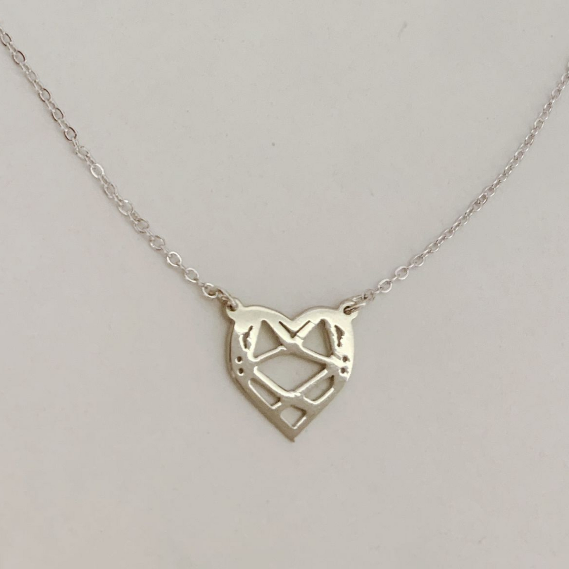 The modern look of our new origami-inspired necklaces is undeniable. This heart-shaped necklace could white or yellow gold-plated. A very spirited addition to any jewelry box! Could white or yellow gold-plated.