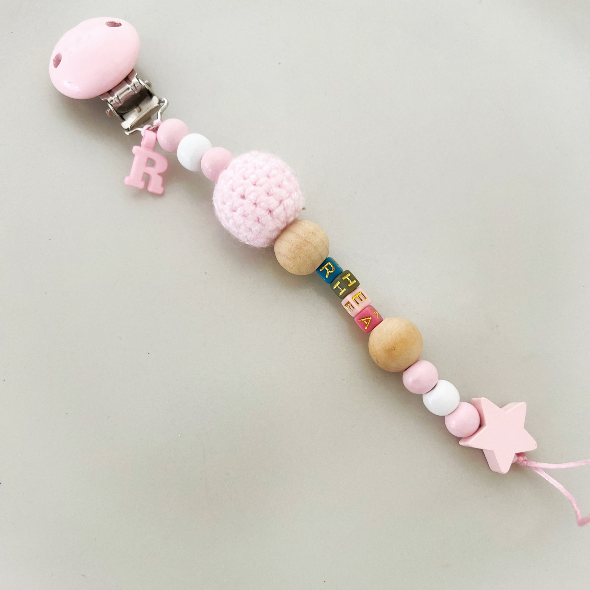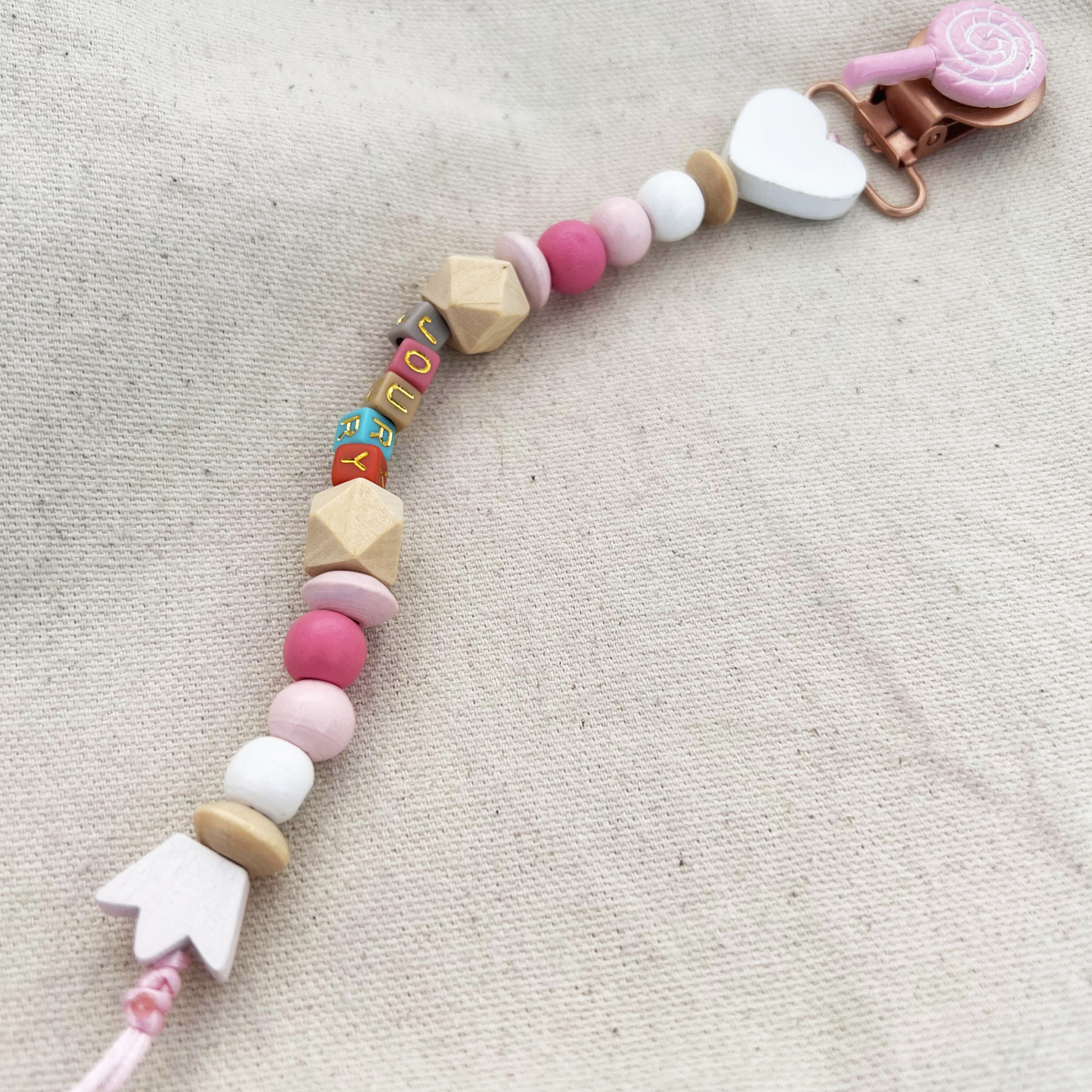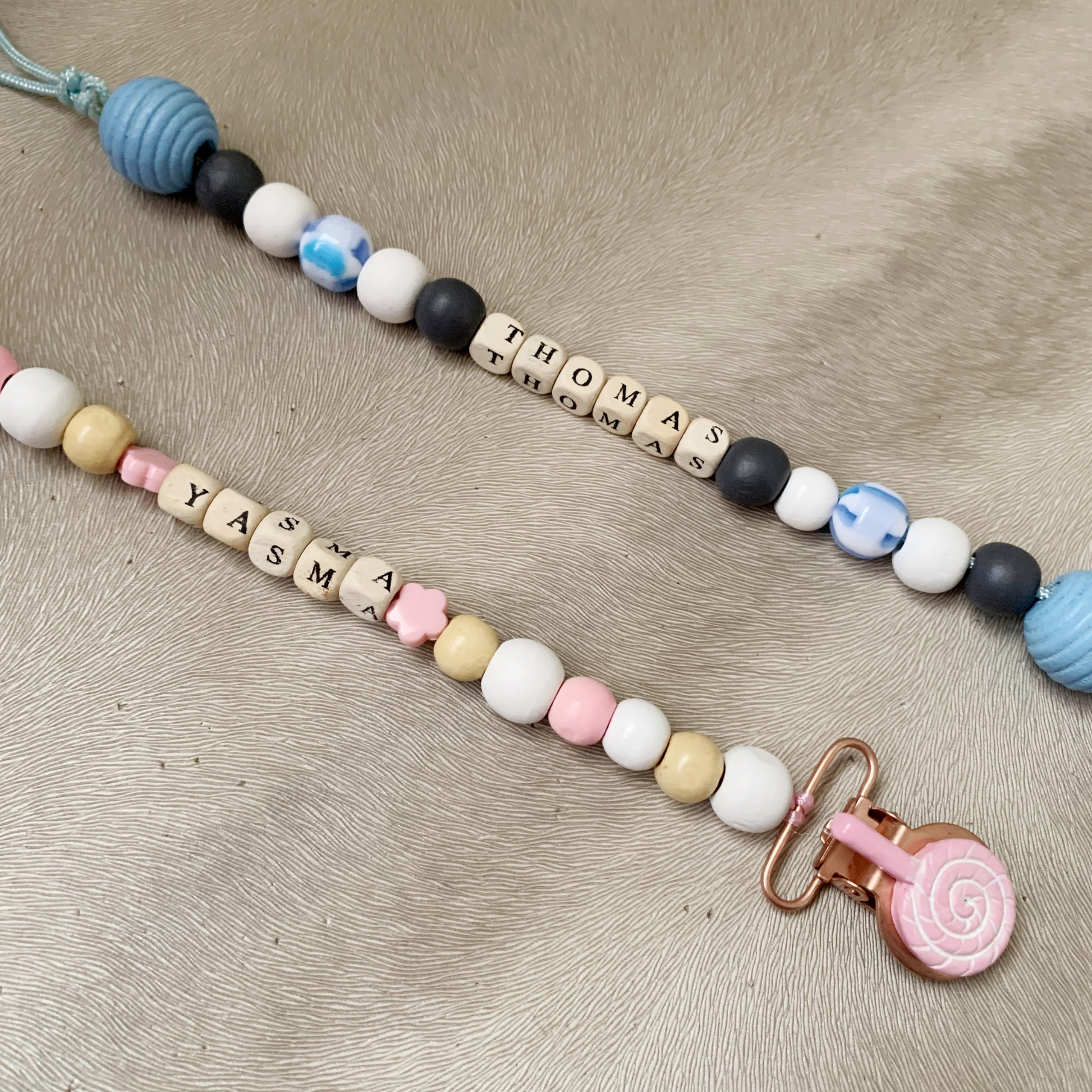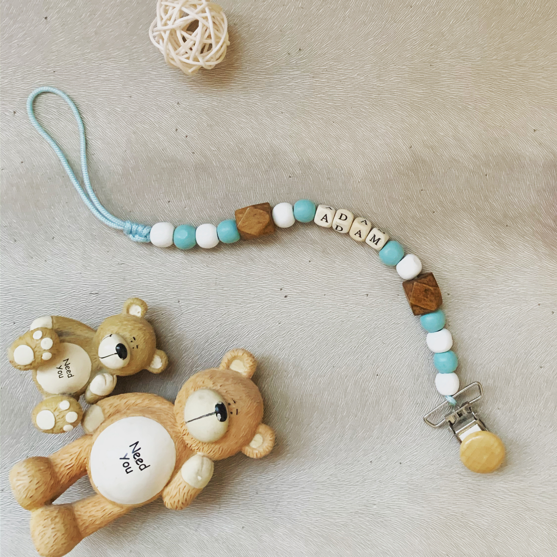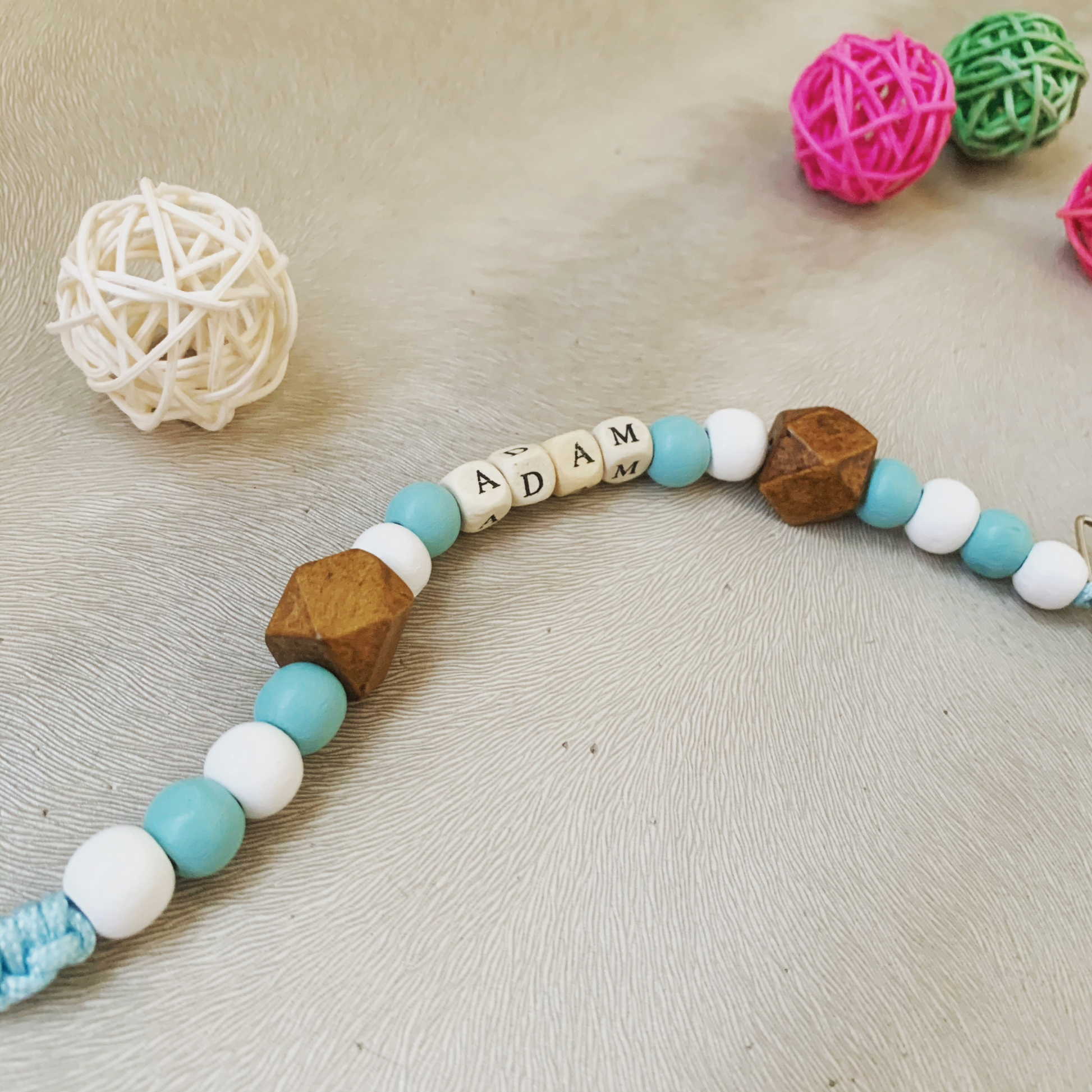 Pacifier strap customized with the name of your choice. Comes with a variety of baby-friendly colors. High quality soft wood. Baby safe.