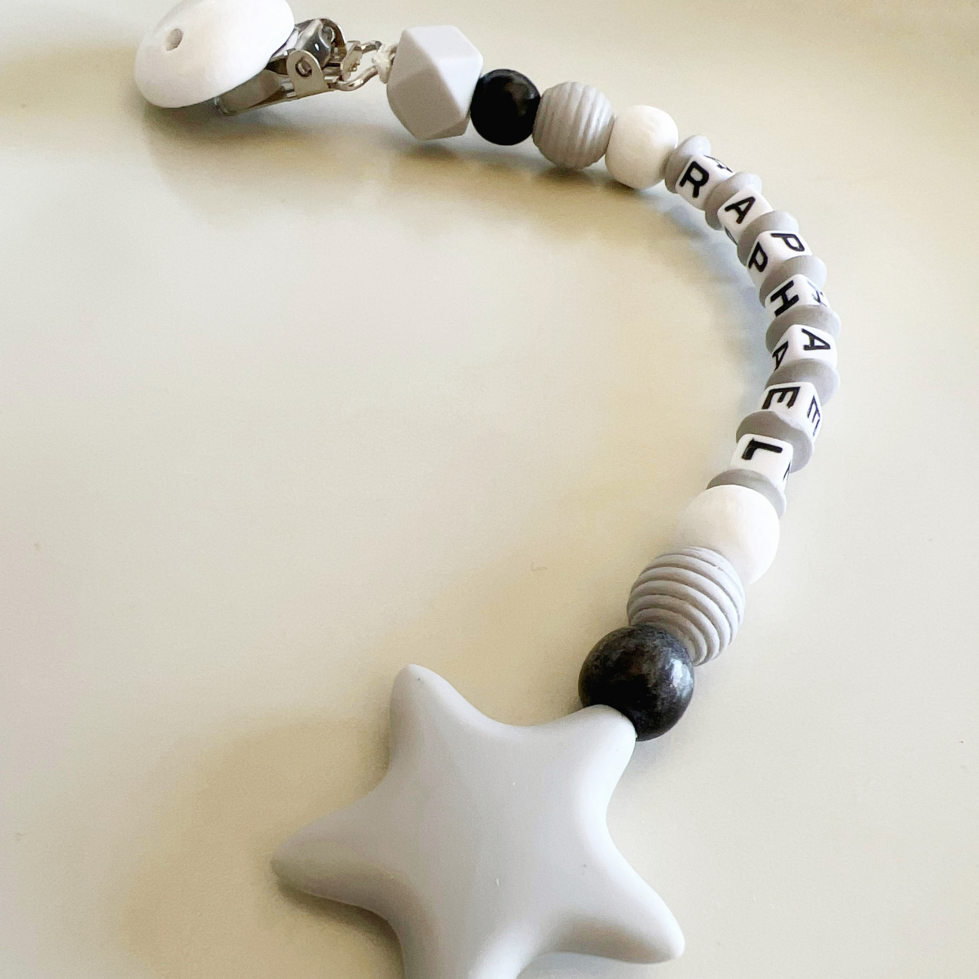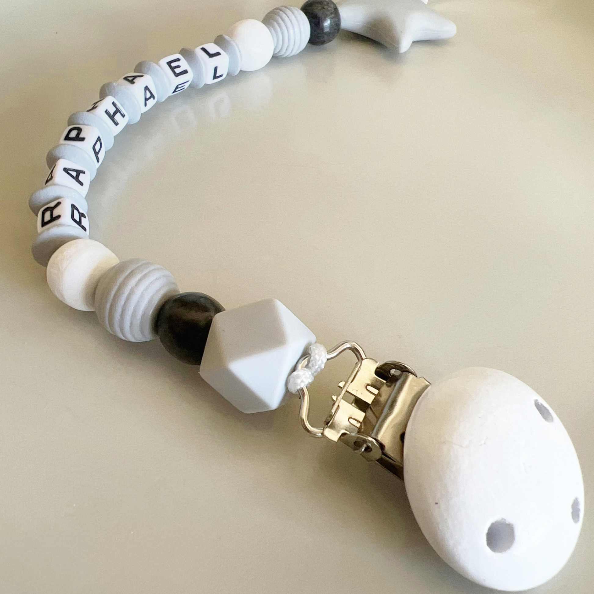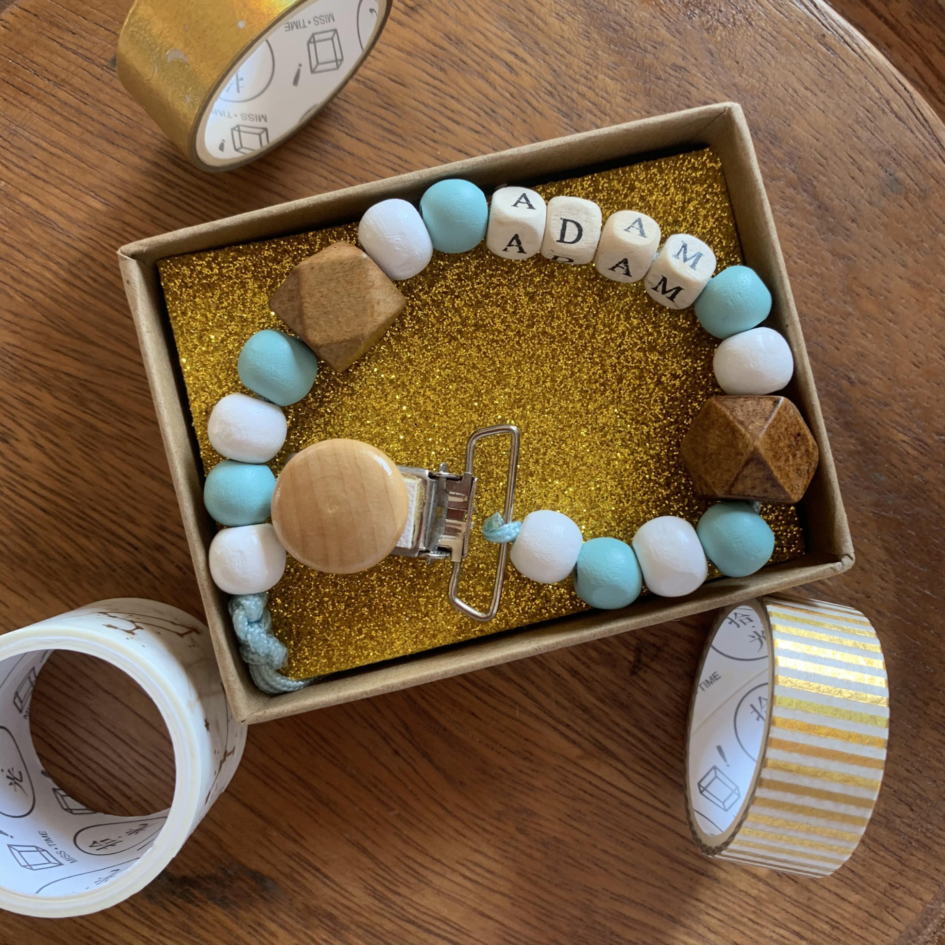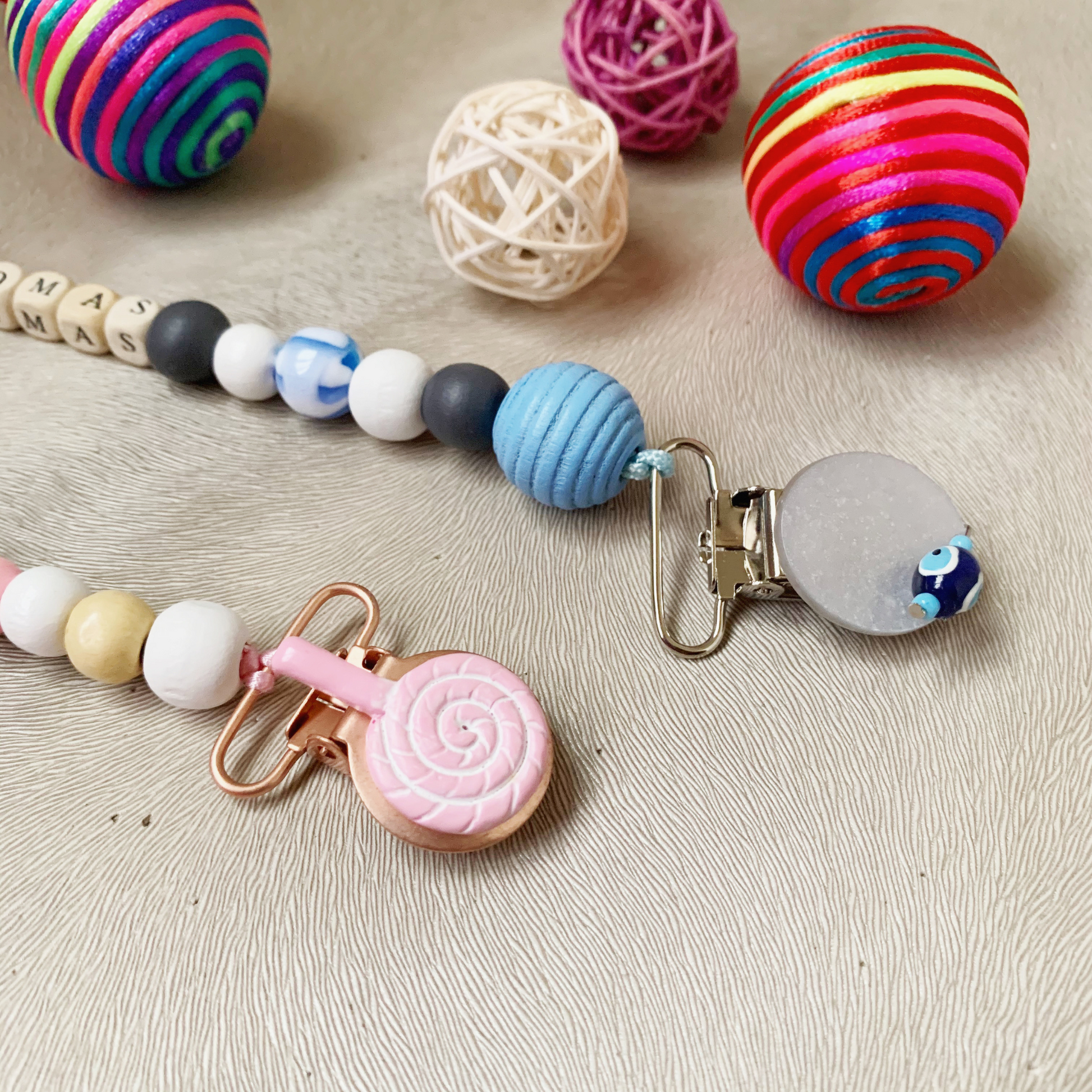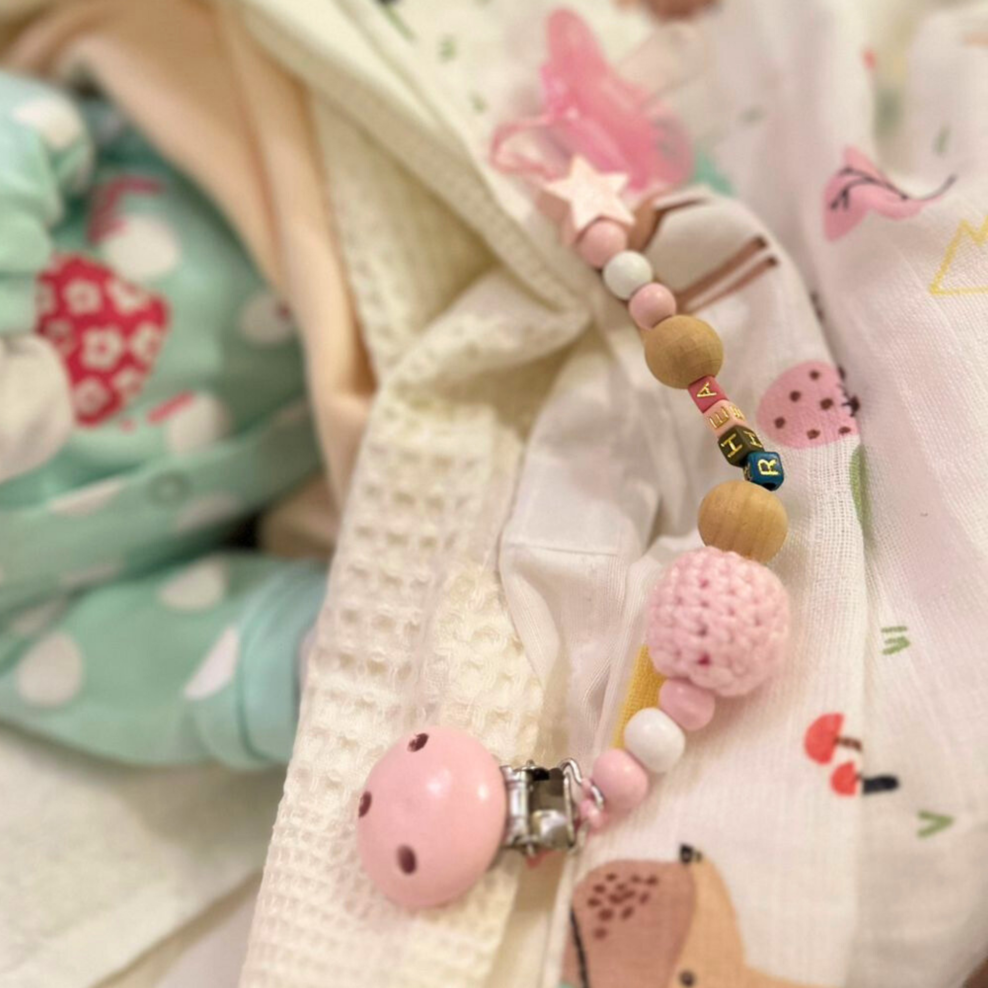 Pacifier strap customized with the name of your choice. Comes with a variety of baby-friendly colors. High quality soft wood. Baby safe.